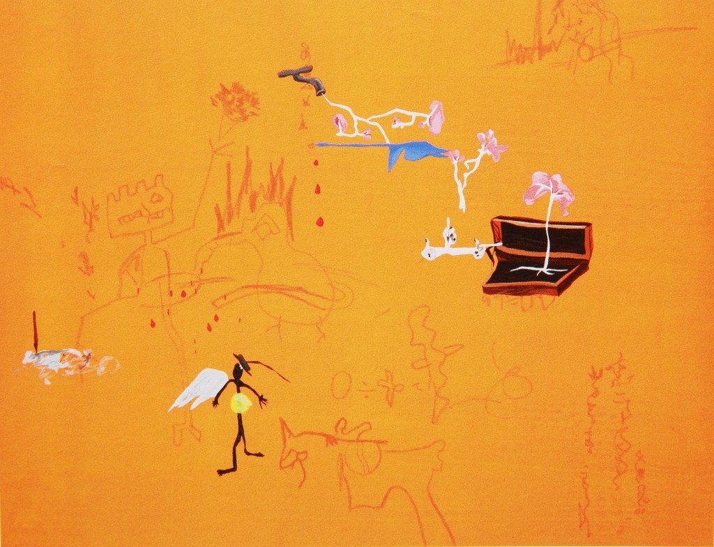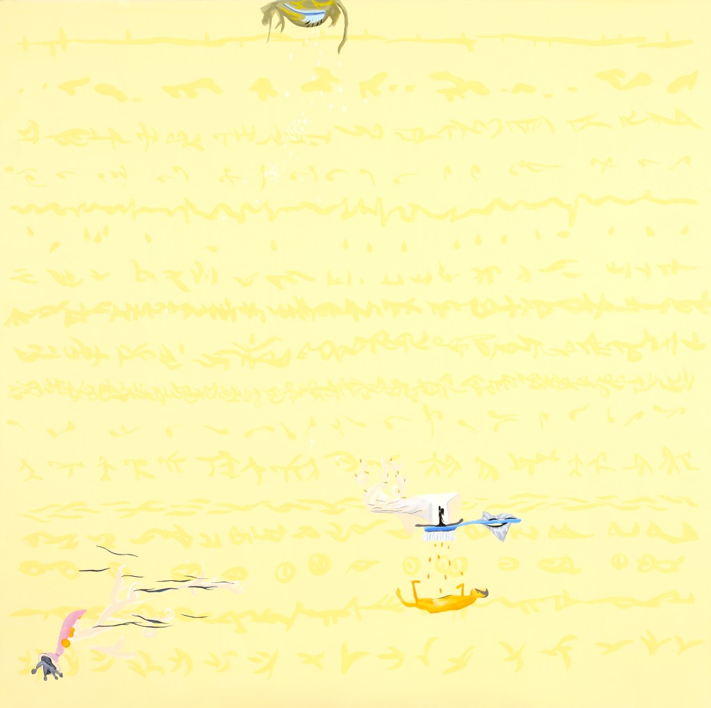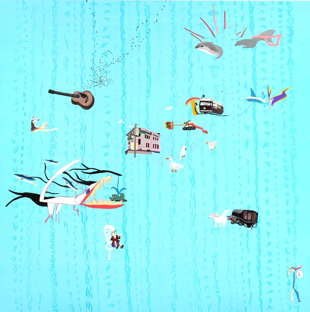 That kind of impression is effectively revealed through the contrastive juxtaposition of noticeable characters against a yellowish background, thus offering an emotional empathy in the minds of the viewer. The characters in the canvas not only get harmonized with a variety of figures and shapes, but also evoke an illusive image as if they are about to jump out of the painting any minute and walk around.